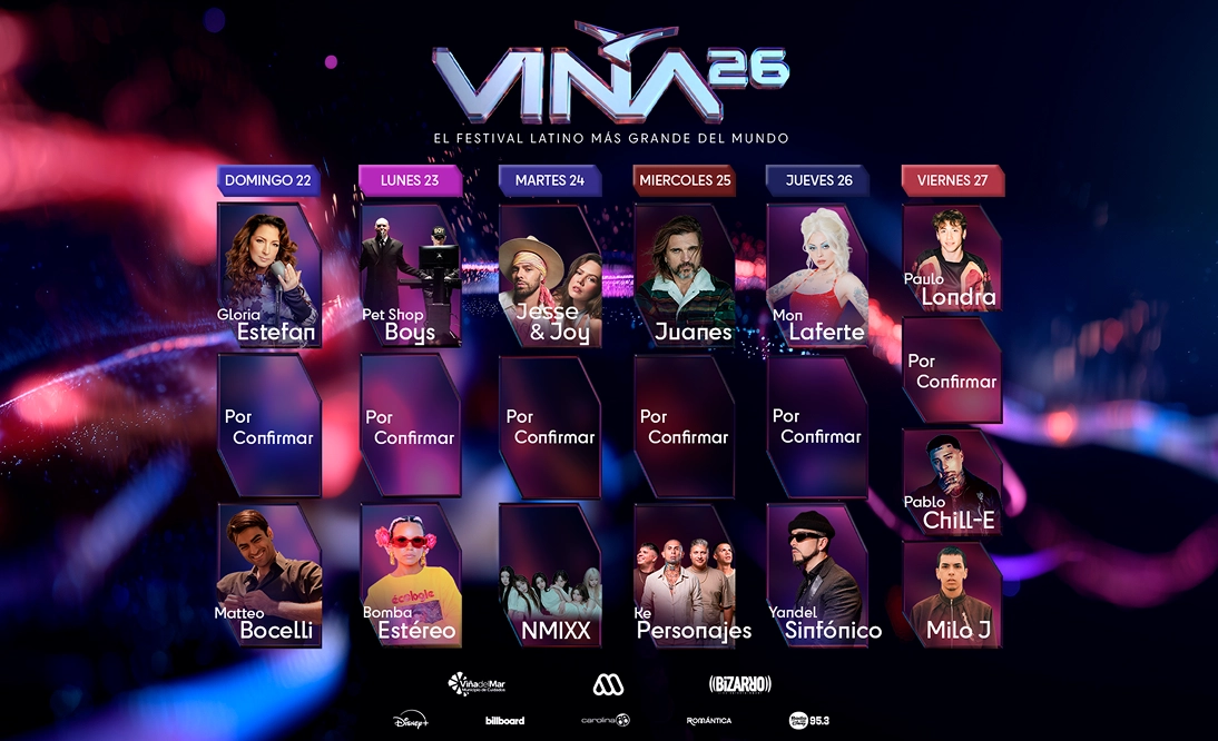 Artistas de renombre internacional, multipremiados y con talento inigualable pisarán laQuinta Vergara este 2026 como la banda angla Pet Shop Boys; los chilenos Mon Laferte yPablo Chill-E; la icónica Gloria Estefan; los colombianos Juanes y Bomba Estéreo. Tambiénse suman en esta edición los hermanos Jesse & Joy; los argentinos Ke Personajes, Paulo